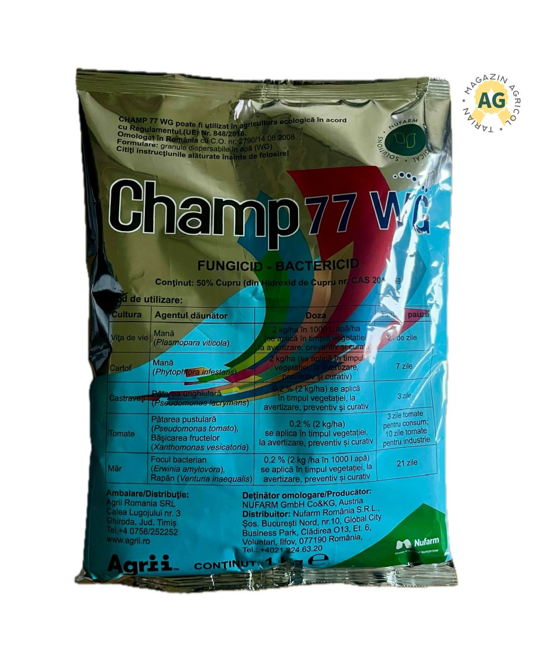 Champ 77 WG este un fungicid/bactericid de contact pe baza de cupru folosit in prevenirea si combaterea manei si a arsurilor bacteriene la vita de vie, pomi fructiferi, legume, cartofi. In amestec cu apa, granulele se dizolva si are loc o redistribuire a ionilor de Cu pe suprafata tratata, acestia actionand asupra fungilor si bacteriilor deopotriva. Produsul adera pe suprafata frunzelor si nu necesita adaugare de adezivi.