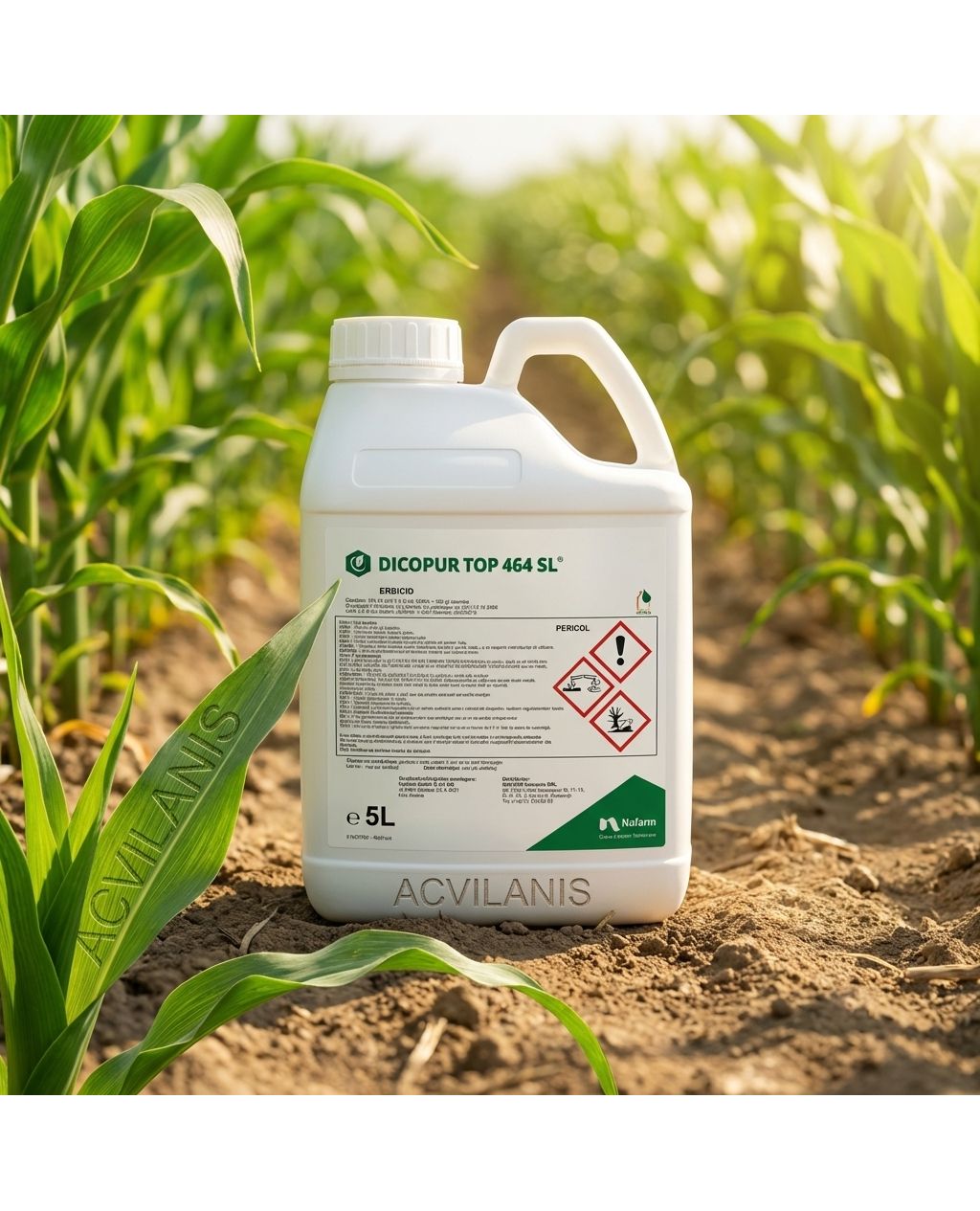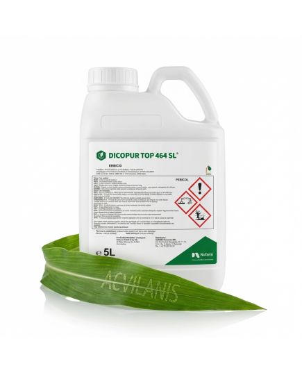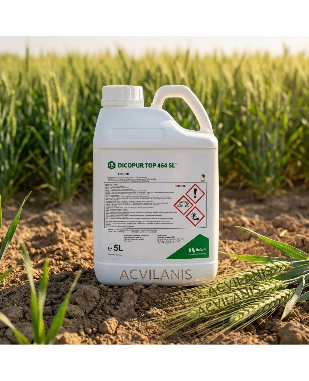 Dicopur TOP 464 SL se aplică în postemergenţă la culturile de grâu şi porumb în vederea combaterii a numeroase specii de buruieni dicotiledonate anuale şi perene. La cultura de grâu, erbicidul se aplică de la faza de înfrăţire a cerealelor până la formarea primului internod, iar speciile de buruieni să fie în fază mică, de cca. 2 – 4 frunze și maxim 10–15 cm înălţime pentru buruienile perene. Nu este recomandată aplicarea erbicidului când cerealele păioase sunt în fază avansată de vegetaţie (peste 3 internodii), deoarece apar efecte fitotoxice, cu reducerea producţiei la hectar. La cultura de porumb, Dicopur TOP 464 SL se aplică atunci când plantele de cultură au 4 – 6 frunze iar buruienile sunt în faza de rozetă. Buruieni dicotiledonate anuale şi perene combătute: Abutilon theophrasti (teişor), Amaranthus retroflexus (ştir sălbatic), Anthemis arvensis (romaniţă), Atriplex spp. (lobodă sălbatică), Brassica nigra (muştar negru), Capsella bursa pastoris (traista ciobanului), Centaurea cyanus (albăstriţă), Chenopodium album (spanac sălbatic), Cirsium arvense (pălămidă), Convolvulus arvensis (volbură), Delphinium consolida (nemţişor de câmp), Fumaria officinalis (fumăriţă), Matricaria chamomilla (muşeţel mirositor), Polygonum aviculare (troscot), Raphanus spp. (ridiche sălbatică), Polygonum convolvulus (hrişcă urcătoare), Rubus caesius (mur de mirişte), Rumex acetosa (măcriş), Senecio vulgaris (spălăcioasă), Sinapis arvensis (muştar sălbatic), Sisymbrium officinale (voinicică), Solanum nigrum (zârnă), Sonchus arvensis (susai), Stellaria media (rocoină), Vicia spp. (măzăriche), Xanthium italicum (cornuți).