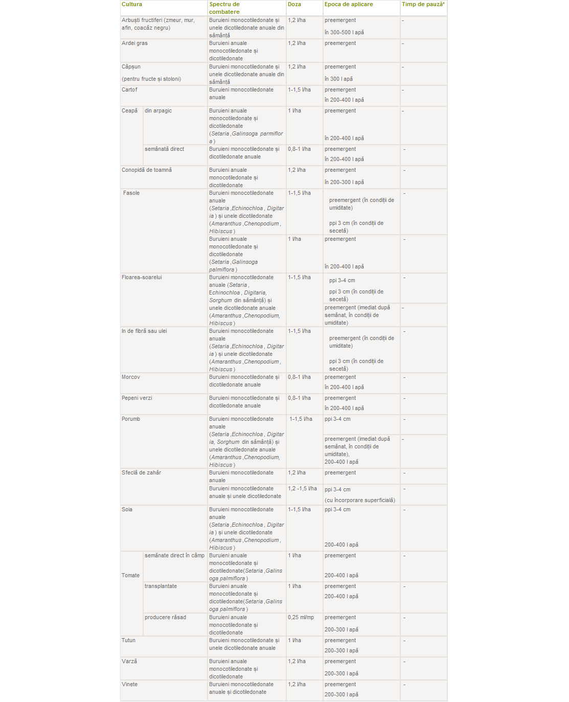 1-1.5 l/ha ppi 3-4 cm in conditii de seceta/preemergent imediat dupa semanta in conditii de umiditate