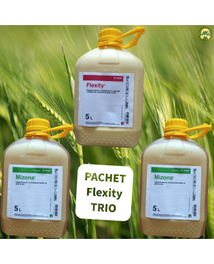 Pachetul fungicid Flexity® Trio oferă un spectru larg de combatere a bolilor la grâu și orz. Flexity® Trio este compus din două fungicide: 10 litri Mizona® și 5 litri Flexity®, suficient pentru tratarea unei suprafețe de 20 ha.