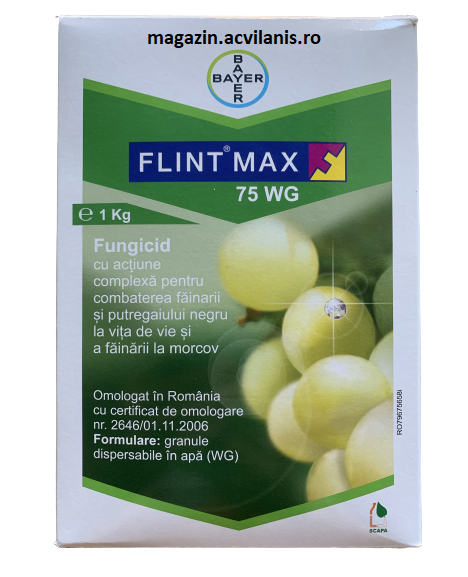 Flint Max este un produs cu spectru larg de acţiune. Trifloxistrobin, din grupa chimică strobilurine, are acţiune preventivă şi activitate mesostemică. Este puternic absorbit de stratul ceros al frunzelor, fiind rezistent la spălarea prin precipitaţii.