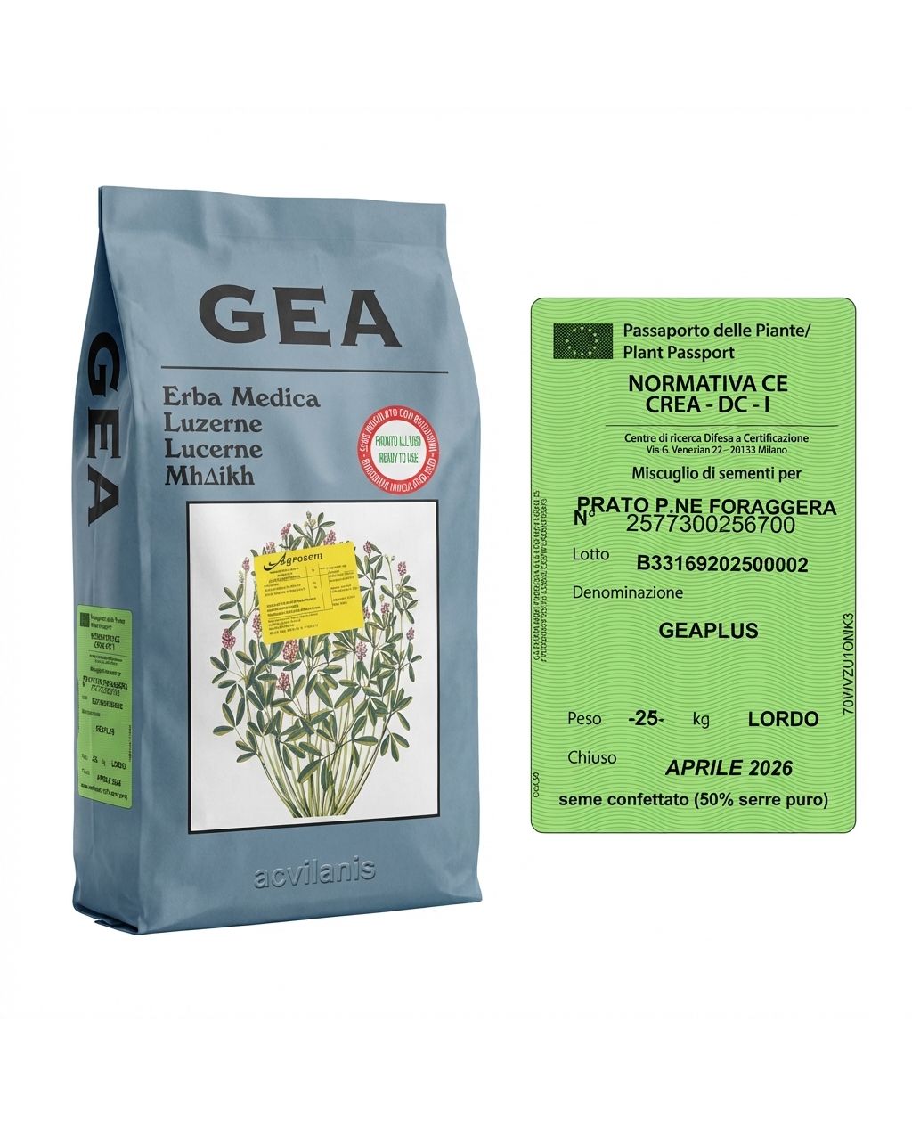 Lucerna GEA reprezintă o gamă largă de tip mediteranian, care are un bun raport frunză/tulpină. Produce furaje de înaltă calitate, cu un conținut mare de proteine. Are un sistem de rădăcini foarte bine dezvoltate cu o bună rezistență la secetă și la frig care îi asigura un start rapid al creșterii după perioada de iarnă, de aceea se adaptează în diferite regiuni de cultivare și poate fi semănat in toată țara. Perioada scurtă de regenerare a plantelor la soiul Gea determina un număr mare de cosiri anuale. Acest soi este indicat atât pentru cosit cât și pentru deshidratare. Caracteristice morfo-fiziologice: dimensiune mare, conținut de proteine mare, timp de înflorire mediu, regenerare: 25-28 zile, longevitate mare. Prezinta o toleranta mare la inghet si seceta precum si o rezistenta crescuta la boli.
