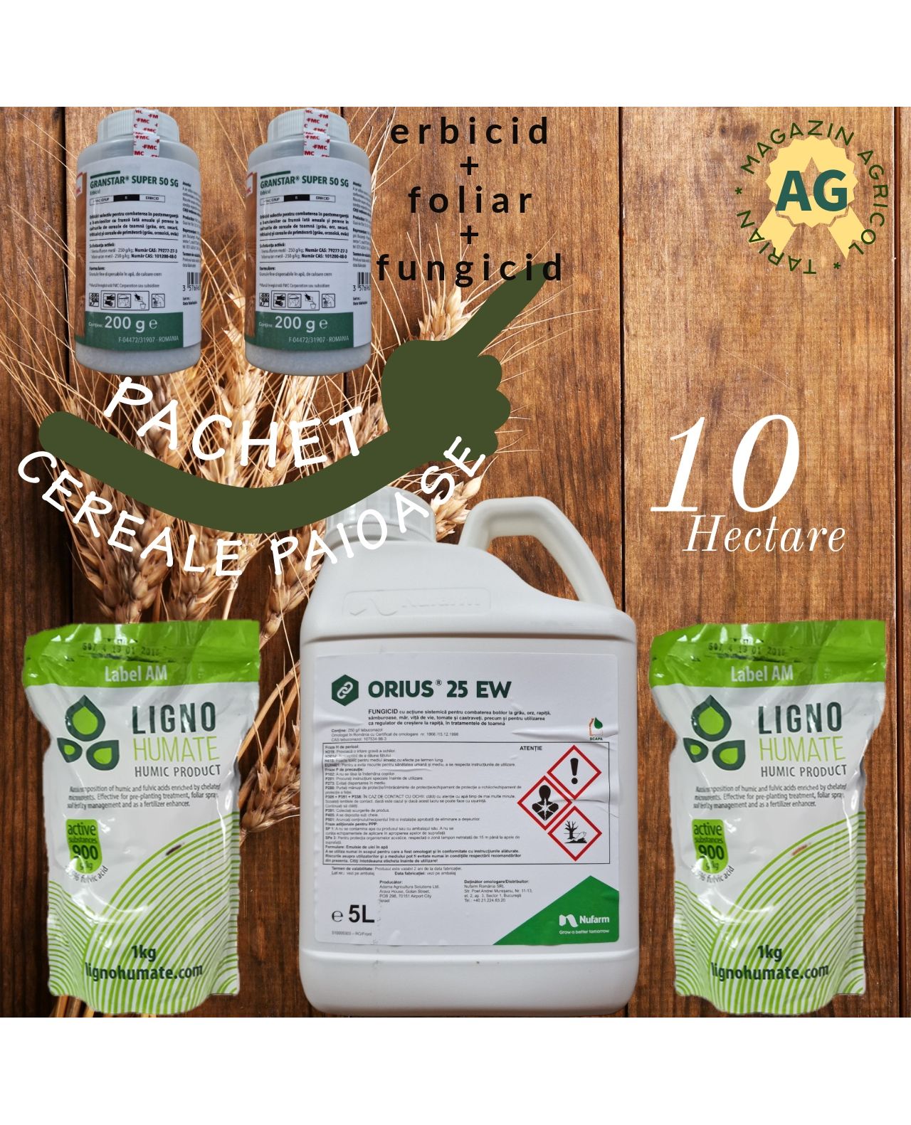 SOLUȚIA COMPLETA PENTRU COMBATEREA BURUIENILOR CU FRUNZA LATA PLUS FUNGICID SI FOLIAR IN CULTURA DE CEREALE PAIOASE, CU APLICARE POSTEMERGENTĂ PENTRU 10 HECTARE