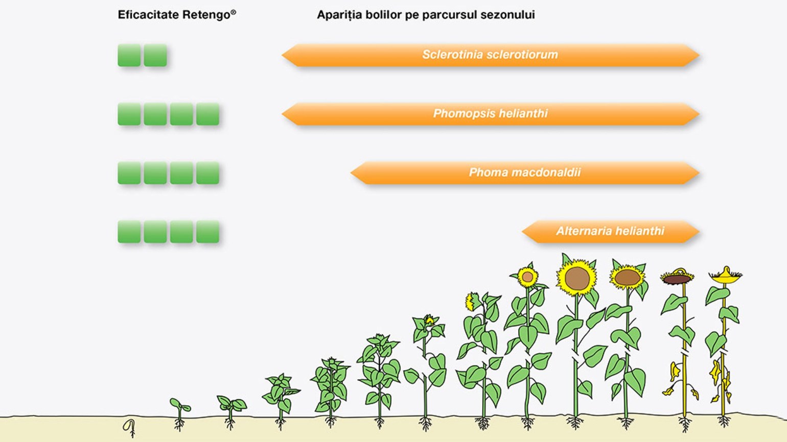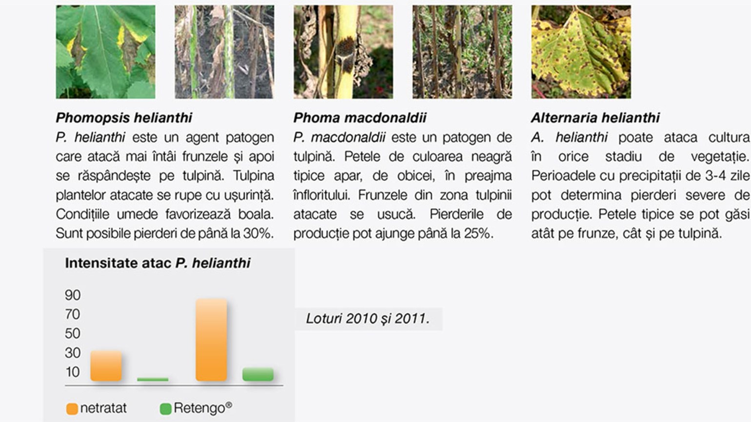 Pentru cultura de floarea-soarelui, fungicidul Retengo® oferă eficacitate deosebită în controlul Phomopsis helianthi, Phoma macdonaldii, Alternaria helianthi și Sclerotinia sclerotiorum.