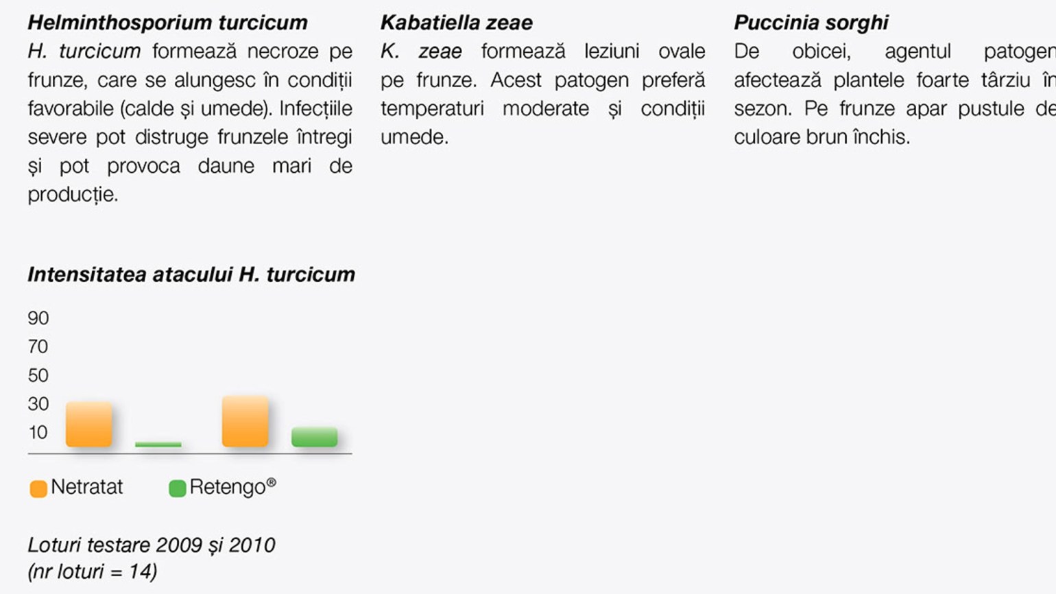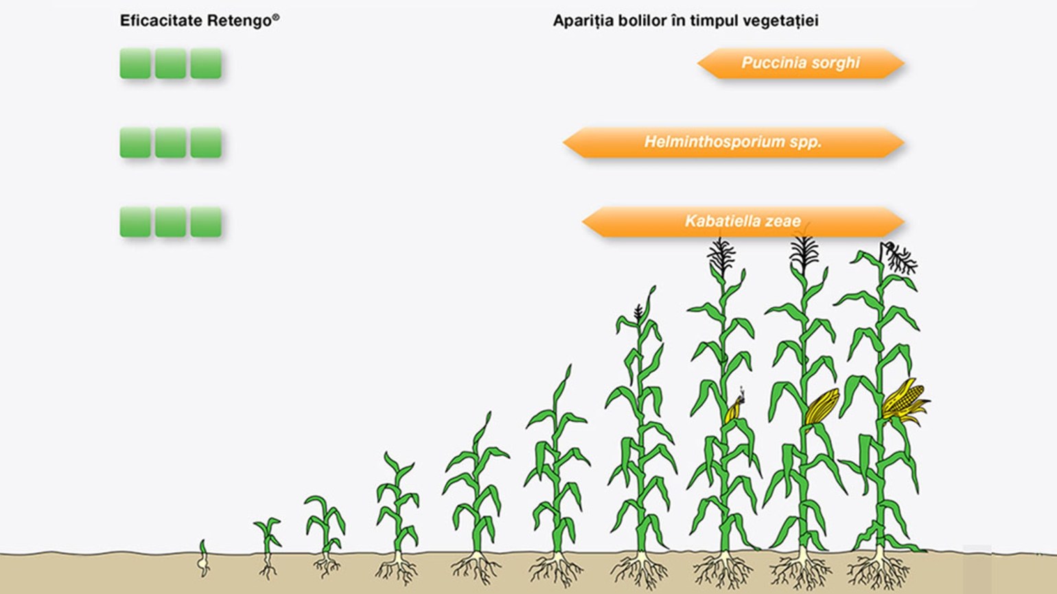 În ceea ce privește cultura de porumb, fungicidul Retengo® oferă protecție împotriva Puccinia sorghi, Helmithosporium spp și Kabatiella zeae.
