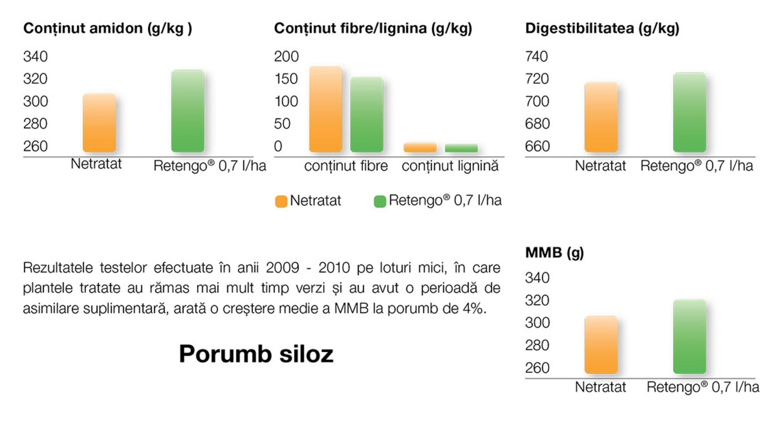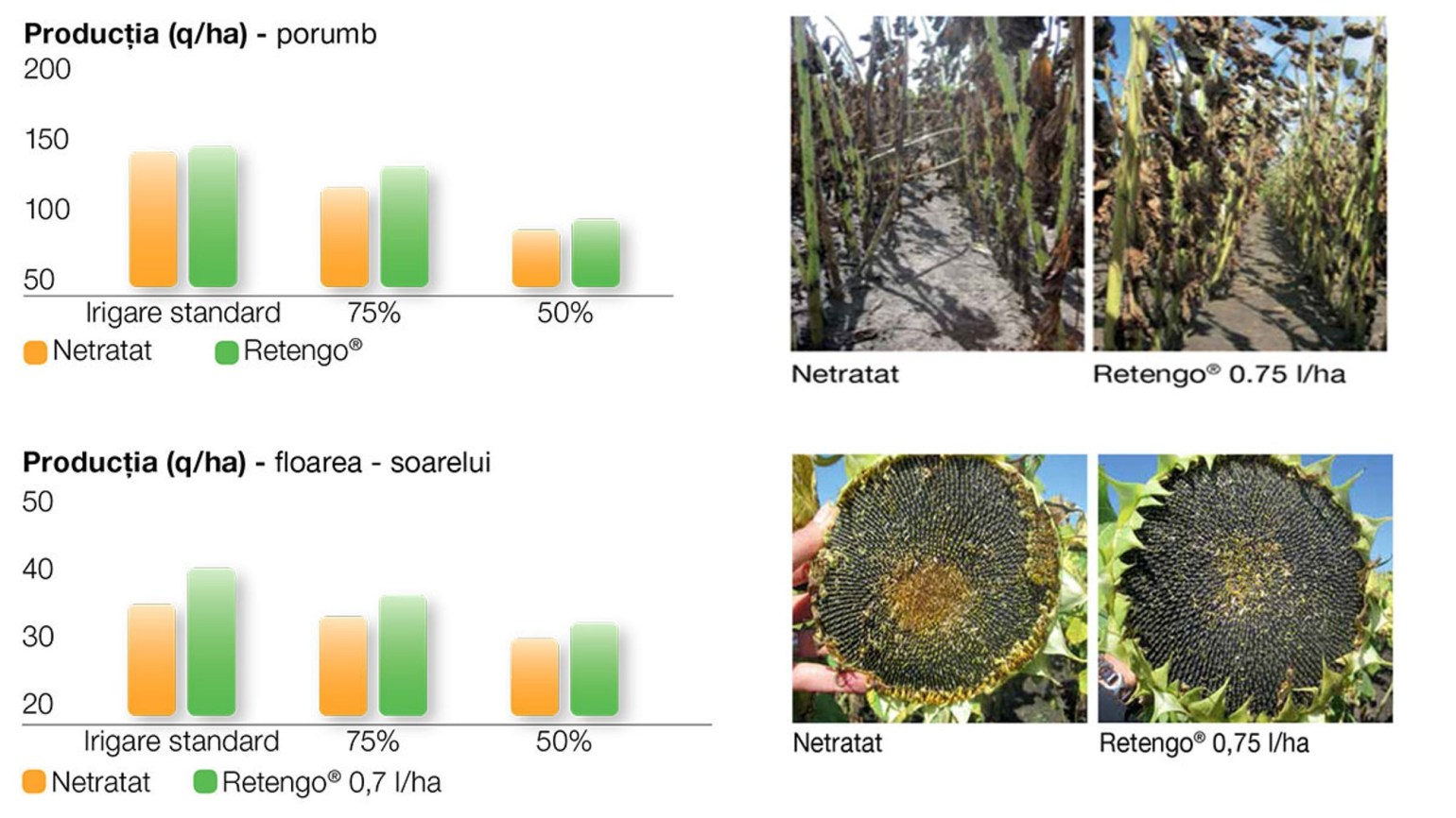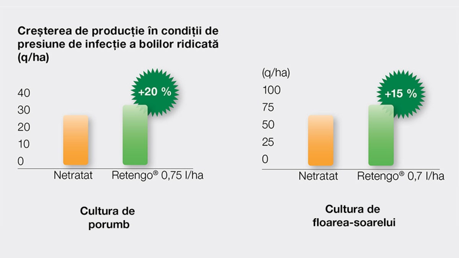 Retengo® crește producția și îmbunătățește calitatea, controlează un spectru larg de boli ale plantelor, îmbunătățește eficiența creșterii plantelor și crește toleranța la stres, contribuind la creșterea producției de floarea-soarelui și porumb. Aplicând fungicidul Retengo® veți obține, simultan cu sporuri de producție, o creștere a materialului recoltat, obținând, de asemenea, și o productivitate crescută la recoltare.