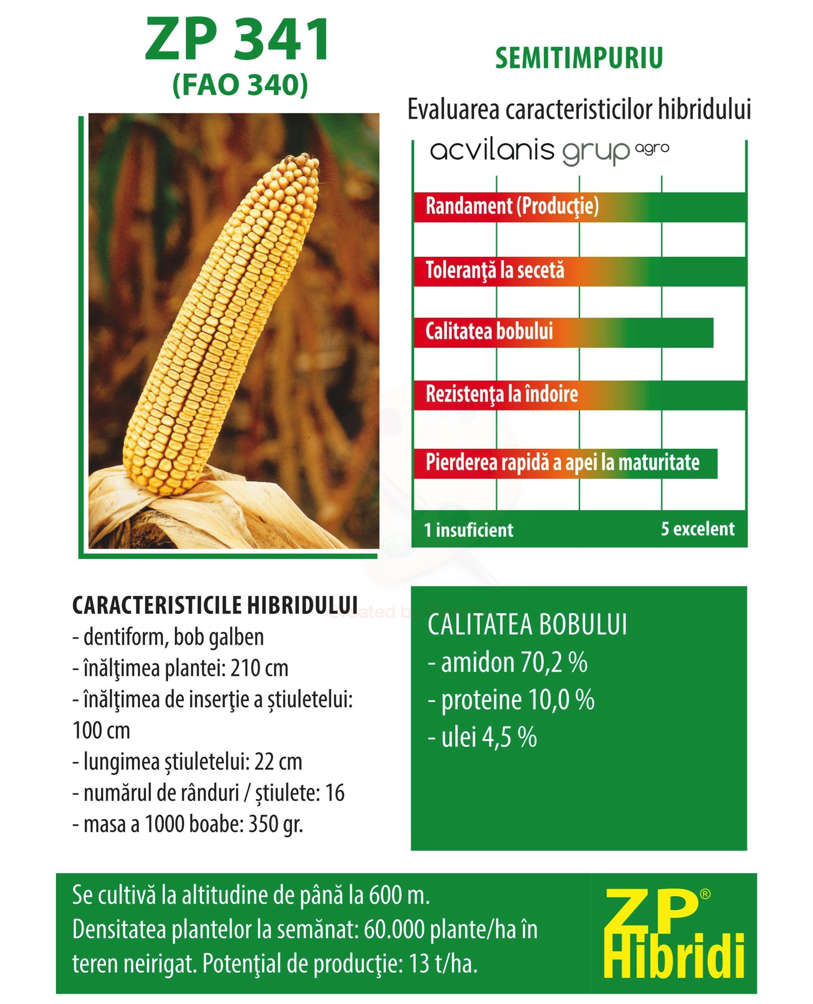 Porumbul ZP 341 are un potential de productie mare, o puternica toleranta la seceta, o rezistenta la indoire sporita, iar calitatea bobului este foarte buna
