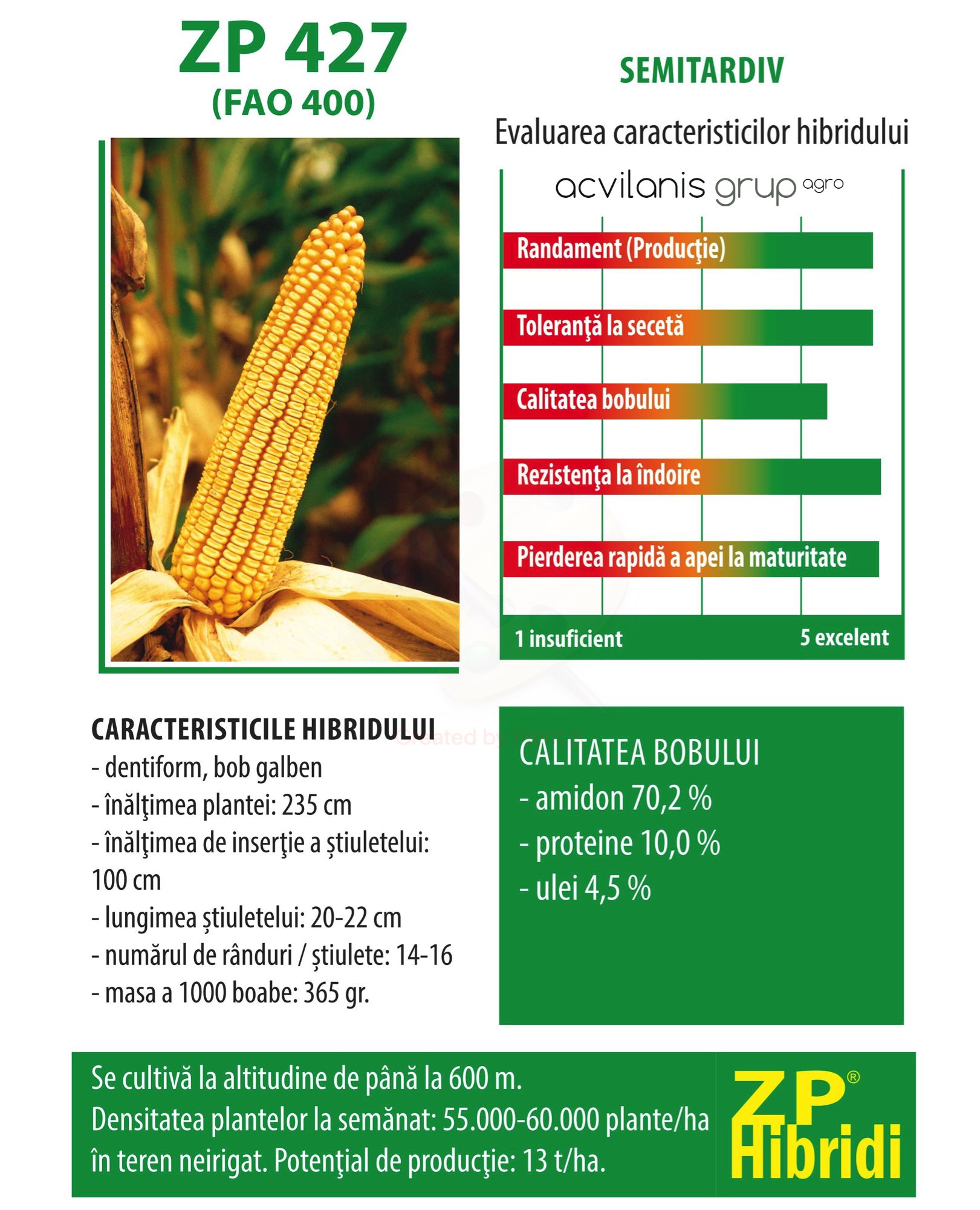 ZP 427 este un hibrid de porumb semitardiv, recomandat pentru productia de boabe, dar si pentru siloz, avand un potential de productie ridicat.